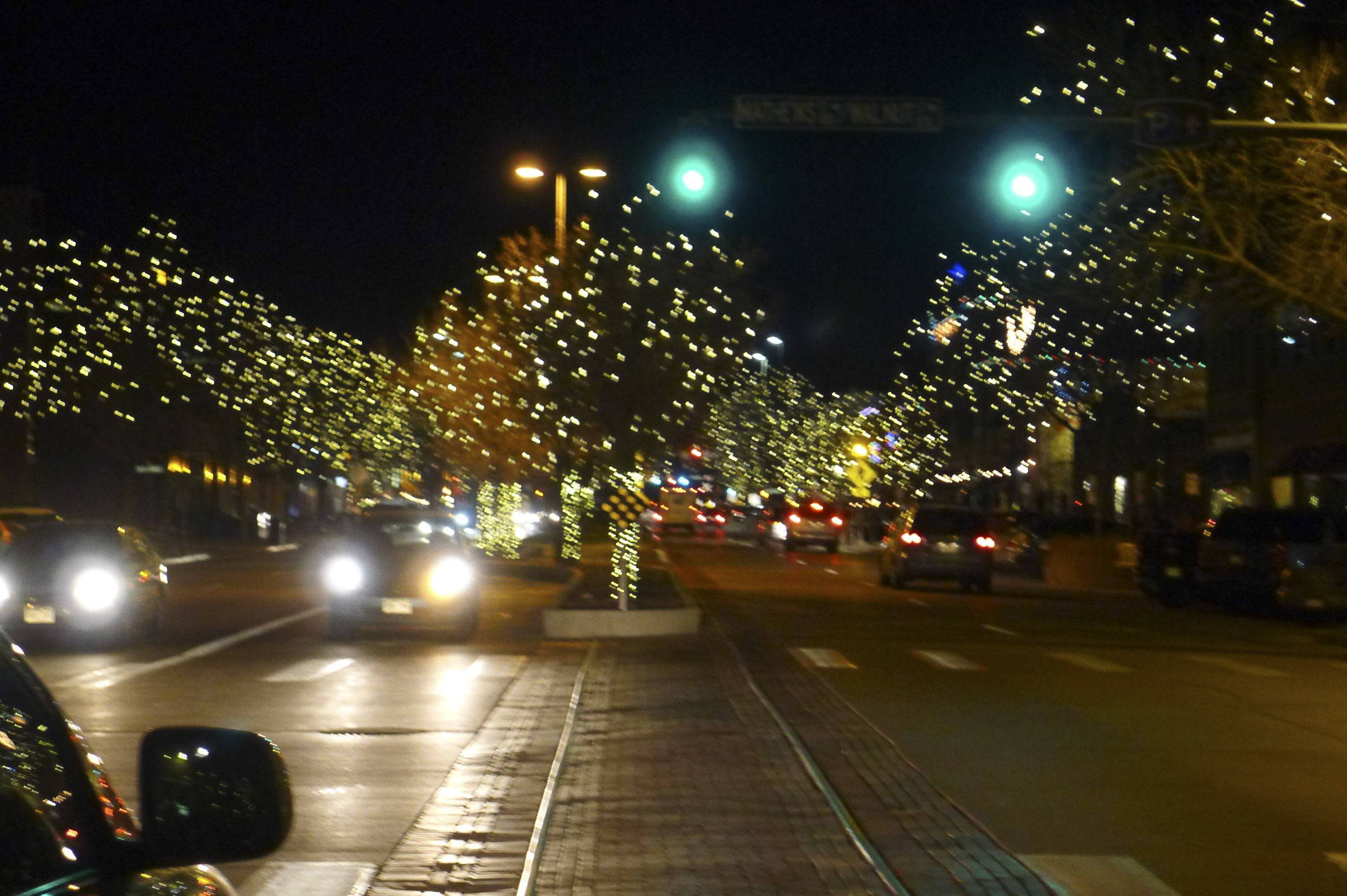 Nice train tracks All the towns I’ve been to so far have been beautiful at night with lit-up trees. I think Ft. Collins took it a little too far, though. These trees probably hamper the function of those train tracks quite a bit.