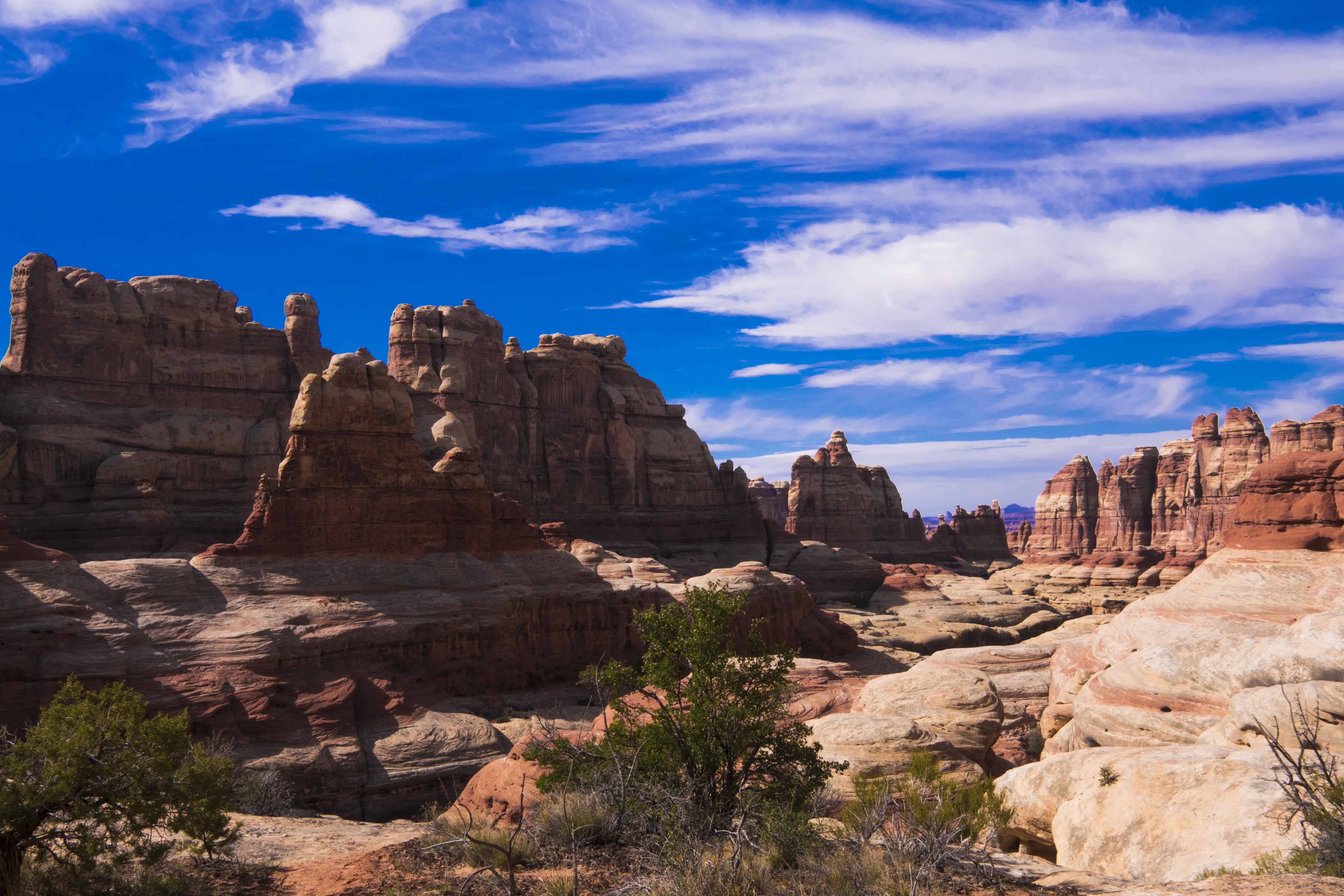 The next morning I was at the visitor center right when they opened and was looking for some trail beta. The ranger suggested either the Chesler Park/Joint loop or the Druid Arch trail, and, as the former sounded more “Needly”, I soon found myself getting ready at the trailhead and setting off towards Chesler Park. The trail was almost entirely over the red rock of that forms Cedar Mesa but was well marked by perfectly placed (for now) cairns. Unlike most other trails I had hiked recently the Chesler Park trail was also nice and flat, apart from a small climb up to a gap in a wall of rock that leads to Chesler Park itself.